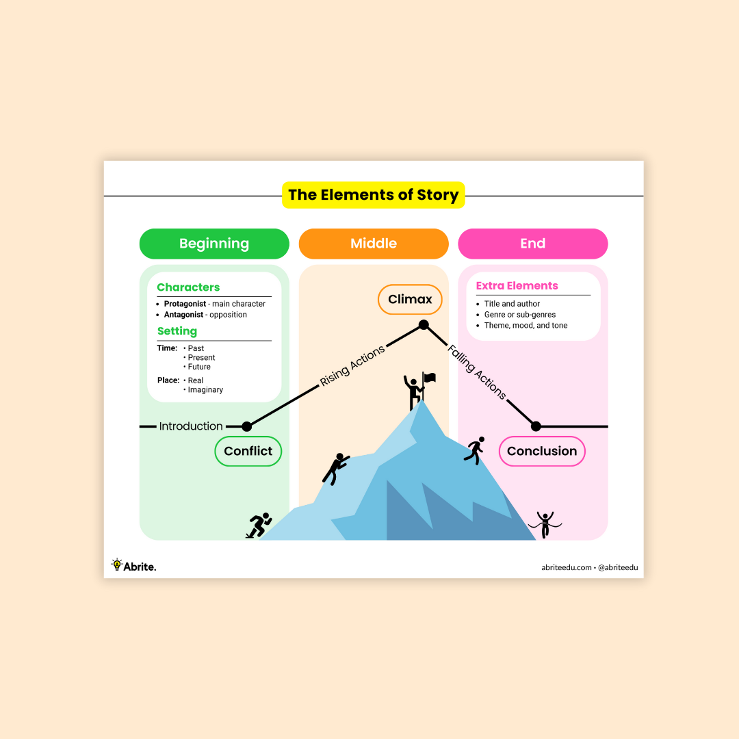This resource breaks down the essential elements of story—setting, characters, conflict, rising action, climax, and conclusion—in a clear, student-friendly format. Learners can quickly reference each component and understand how they work together to build a strong narrative. Perfect for teaching story structure, guiding writing assignments, or reviewing key concepts.