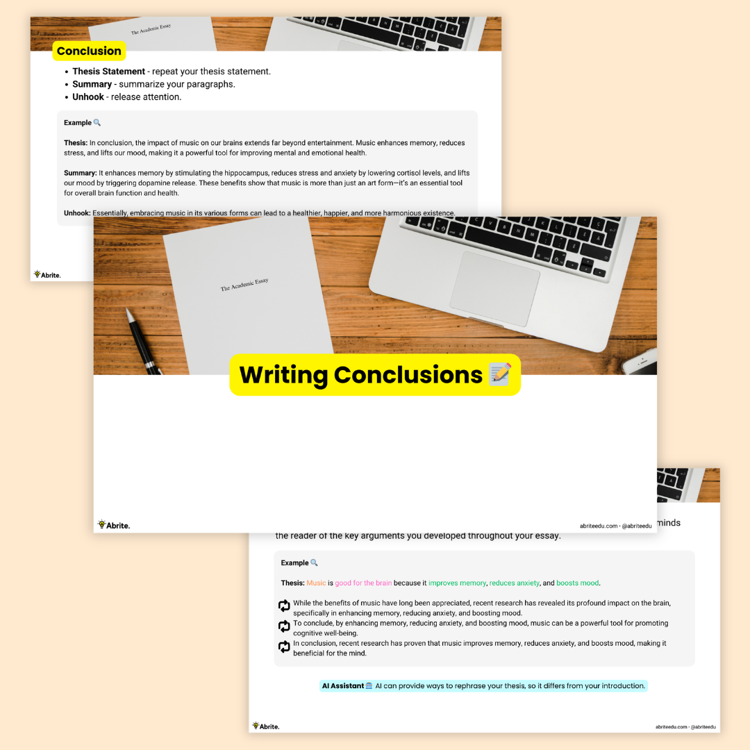 Teach students how to end their essays with clarity, confidence, and impact. Ideal for classrooms, tutoring sessions, or independent study.
